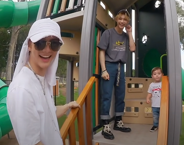「咳!我當然是超級喜歡你了。」黃鉉辰紅著臉,揉揉諾亞的頭,又捏捏李龍馥的小臉以動作掩飾自己的羞怯。